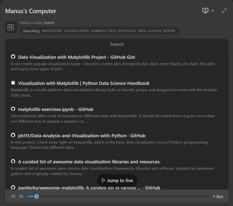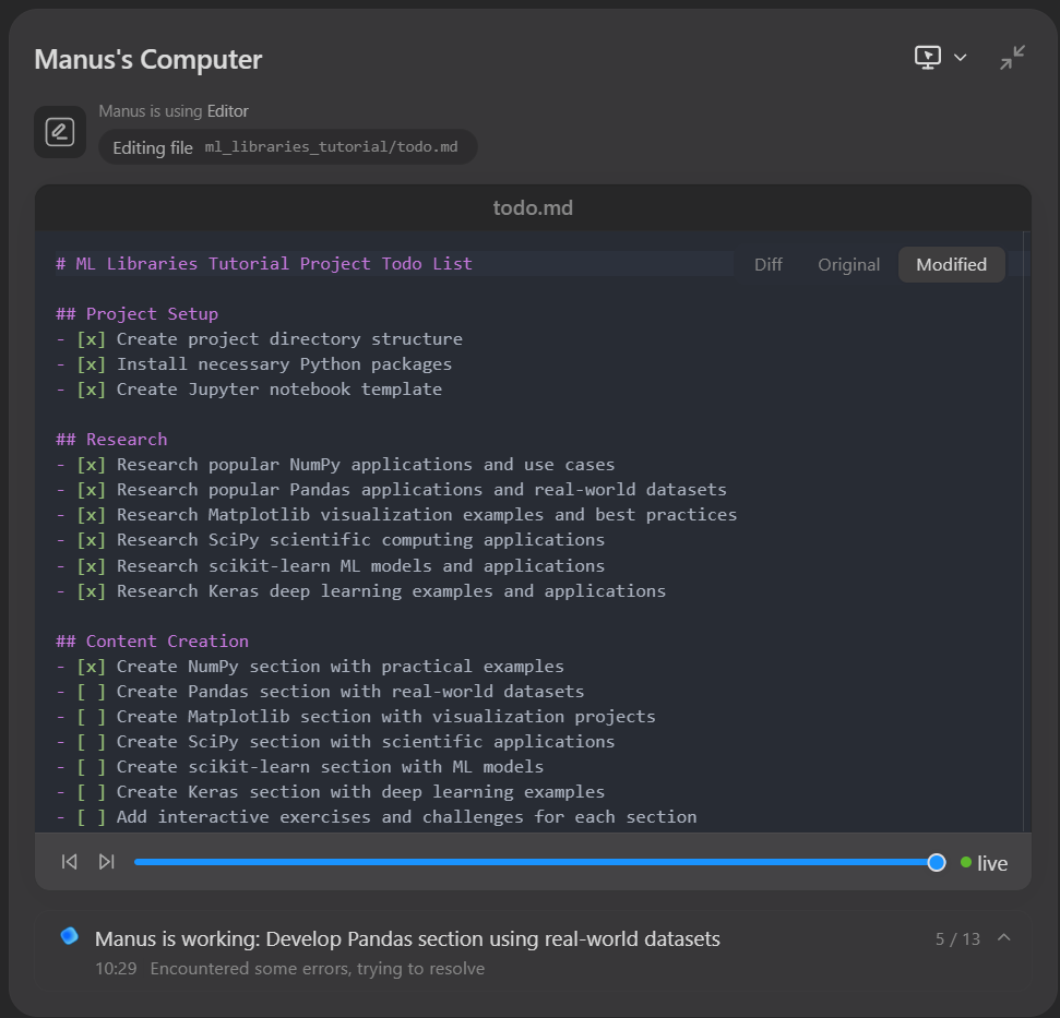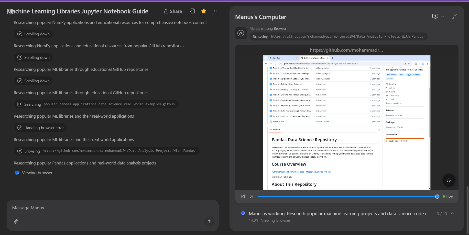Manus exceeded my expectations, compiling a notebook that felt like a masterclass. It drew from GitHub repositories, YouTube tutorials, and blogs, presenting each library in digestible sections. The notebook included theory, sourced examples, clear explanations, and executable code, such as plotting with Matplotlib or running a Scikit-Learn classifier.