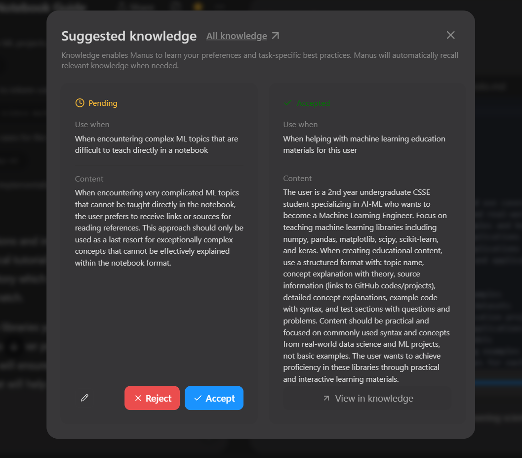 Major props to the Manus AI team for crafting such a powerful yet intuitive tool. The attention to detail, from the clean interface to the thoughtful 'Suggested Knowledge' feature, shows they really get what users need. Despite being in beta, it's already impressive, and I'm excited to see how it evolves.