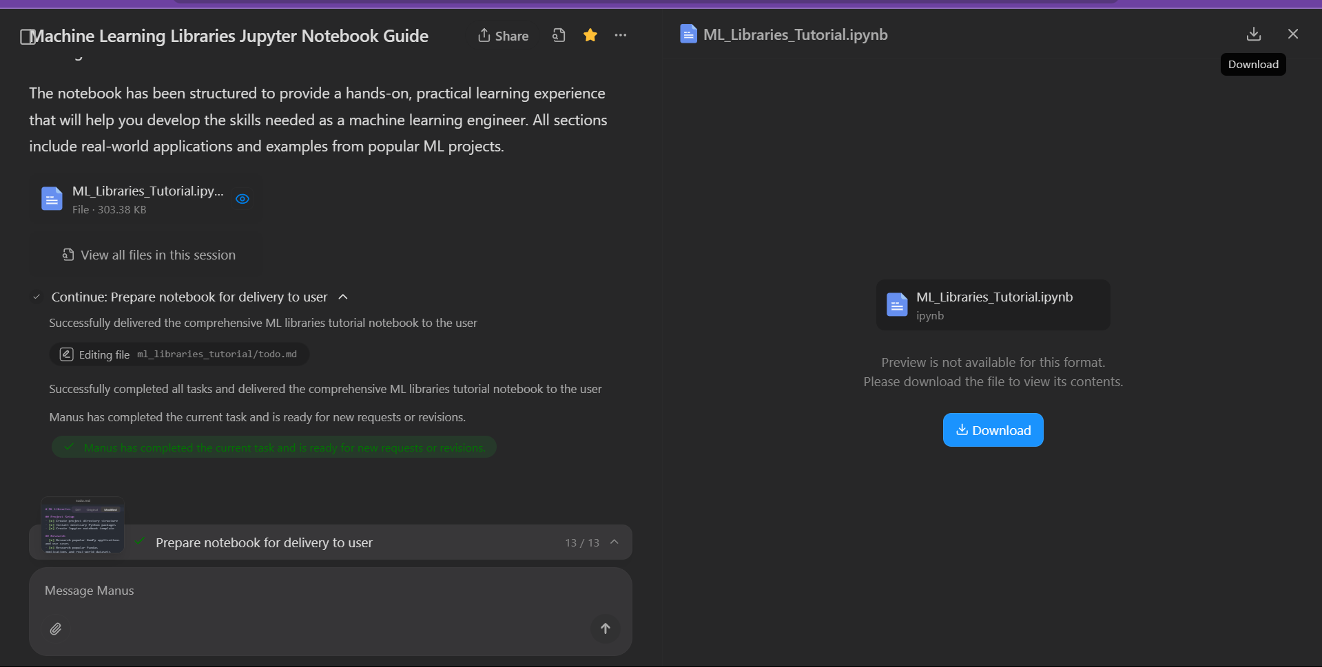 Despite the limits, Manus delivered. The final notebook was a 303.8 KB gem, structured for hands-on learning with real-world applications. For a student, itās a game-changer, turning scattered tutorials into a cohesive ML foundation.