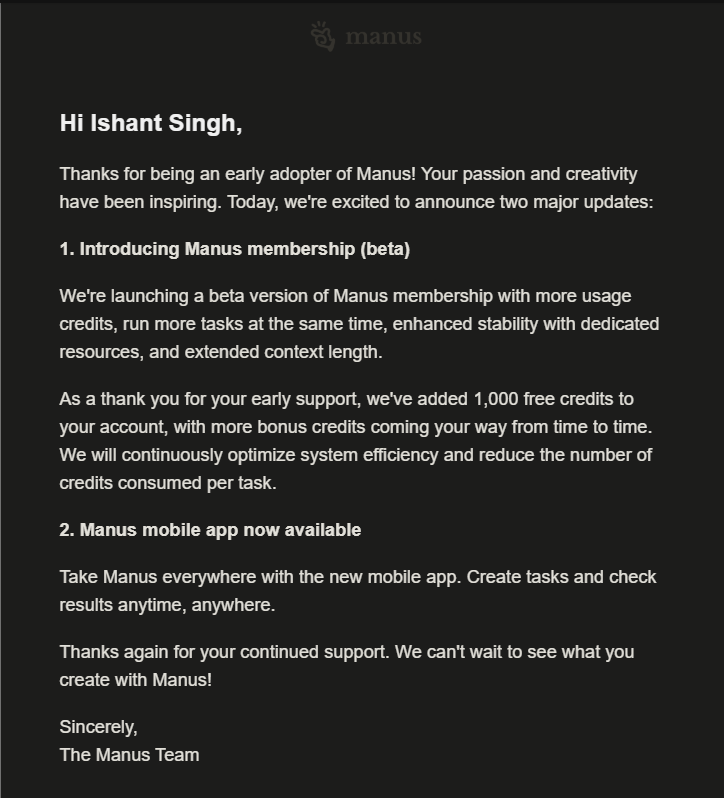 In the last week of March, I received an email from the Manus AI team thanking me for being an early adopter and offering some perks. I used the extra credits wisely for another research project. I haven't tried the mobile app yet but will review it soon.